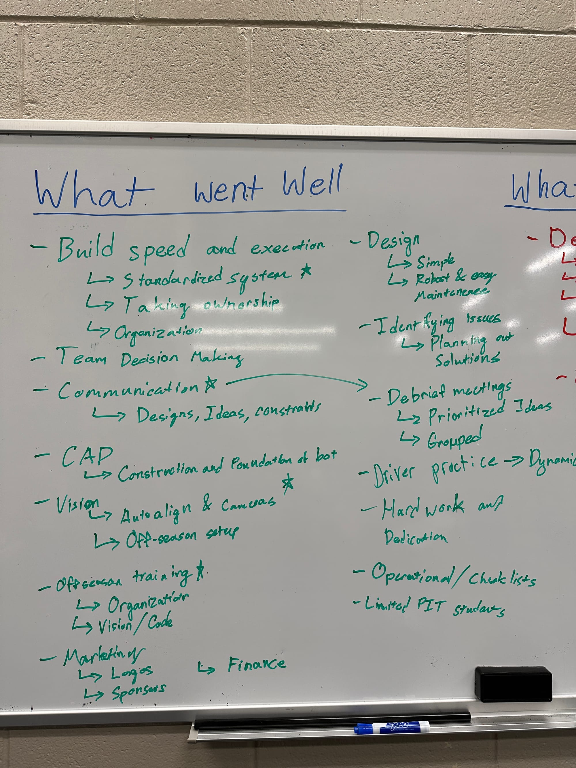 Whiteboard lists of what went well and what went wrong this season.